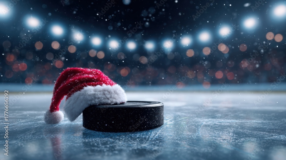 a hockey puck with a red santa hat on an ice rink with blurred stadium lights in the background merry christmas banner poster created with generaitve ai #1776656292