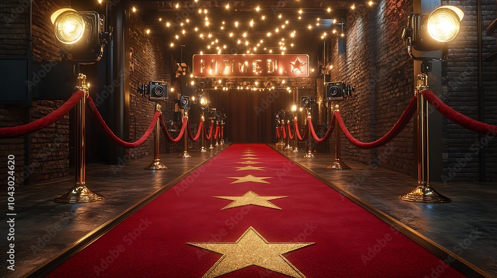 A Hollywood red carpet birthday setup featuring a luxurious red carpet with gold stars, vintage film cameras, and velvet ropes, bright spotlights illuminating the entrance, #1043024620
