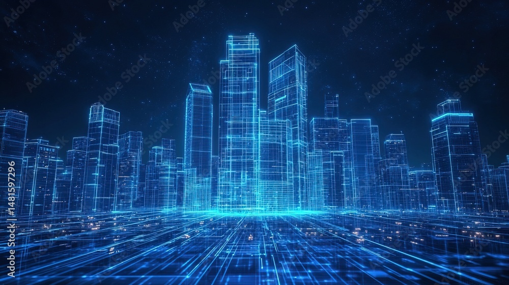 A holographic blueprint of a high-tech smart building in a futuristic city #1481597296