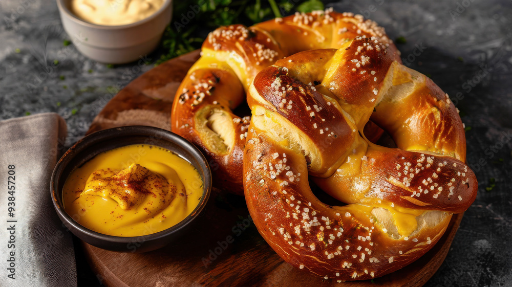 A homemade jumbo pretzel with beer cheese and mustard dipping sauces. #938457208