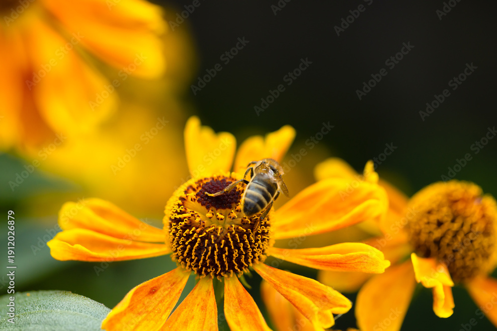 A honey bee collects honey from garden flowers. Beautiful close-up. #1912026879