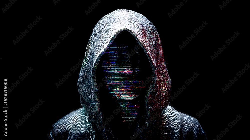 a hooded figure in a dark void, face obscured by glitch effects, streaming code across the skin, anonymous identity formed by data, cyberpunk conceptual art, #1626716006