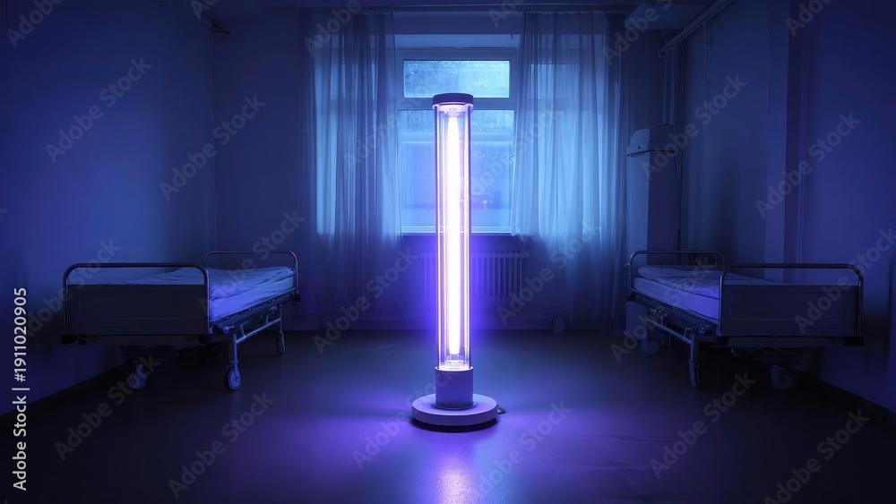 A hospital ward with two empty beds and a tall ultraviolet sterilization lamp in the center glowing purple. Concept Sterile hospital ward, Two empty beds, Purple UV sterilization lamp #1911020905