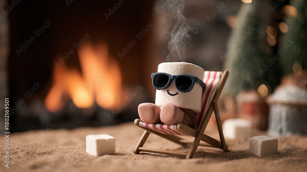 A hot cocoa mug relaxes in a tiny deckchair by a fireplace. Marshmallow "feet" and mini sunglasses. Whimsical steam. Crackling fire pine garlands glowing embers. Warm cozy. #1802169501