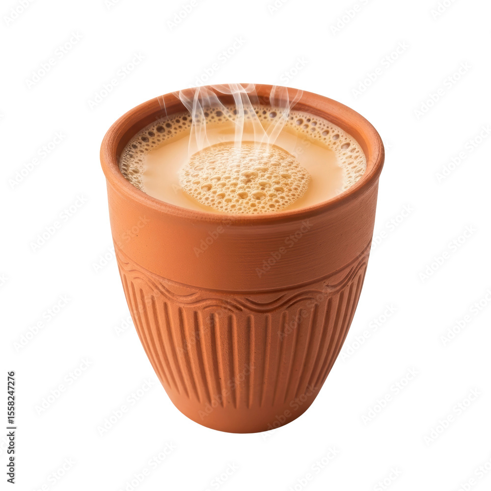 A hot, frothy cup of indian masala chai tea, served in a traditional terracotta kulhad, with steam rising, perfect for illustrating cultural beverages and warm drinks. #1558247276