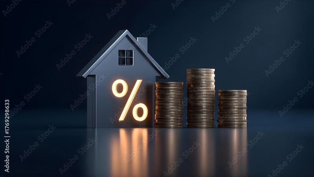 A house icon with a glowing percent sign beside stacks of coins, symbolizing mortgage rates or home loan interest. Concept Mortgage Rates Visualization, Home Loan Interest Signage #1769298633
