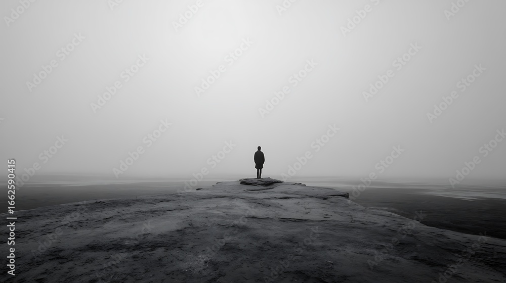 "a human silhouette standing alone on a flat stone plateau, surrounded by miles of emotional emptiness, misty horizon, symbolic of disconnection and mental fatigue, expressive minimalism, moody #1662590415