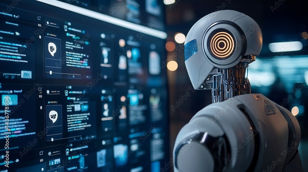 A humanoid robot looking at a large screen displaying social media interface in a dark environment #1436778904