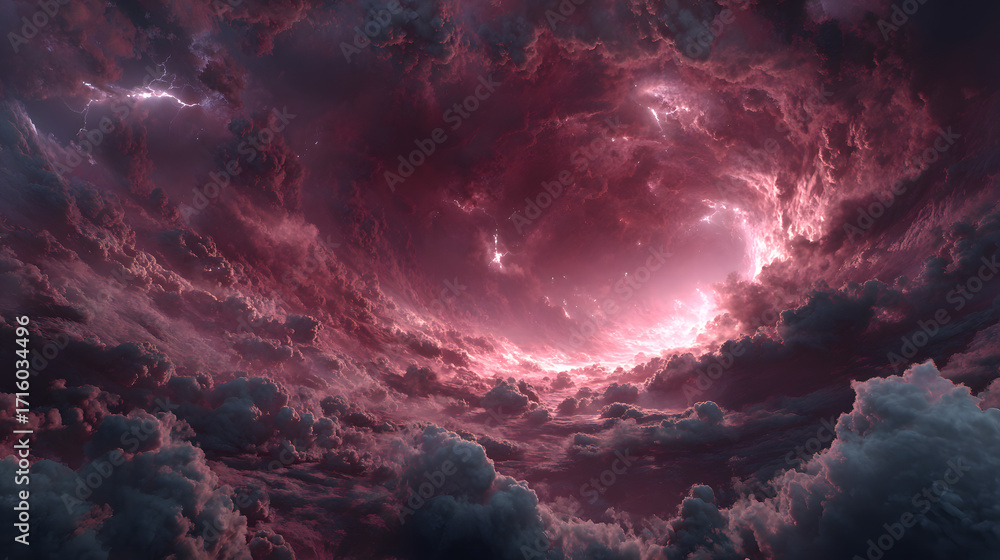 A hyper-detailed wide shot of swirling crimson storm clouds forming a vortex, split apart by crackling violet lightning, exposing a vast starry space stretching beyond the battlefield, #1716034496