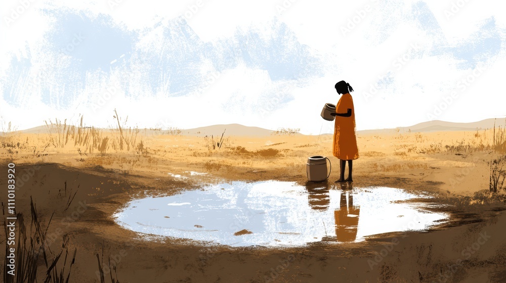A illustration of A lone woman collecting muddy water from a shrinking puddle, set against a backdrop of dry, dusty plains #1110183920