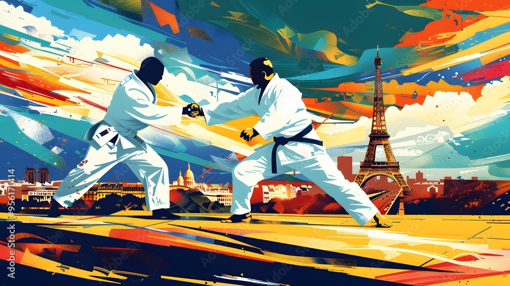 A judo match with Paris landmarks, captured in refined vector design. #956171414