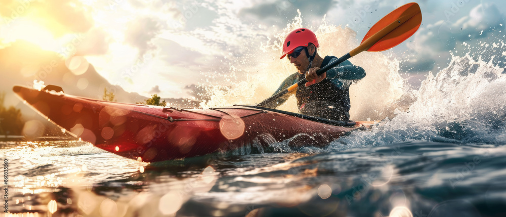 A kayak cuts through the whitewater, with a focused paddler expertly navigating the rushing rapids under a glowing sunset. #860335560