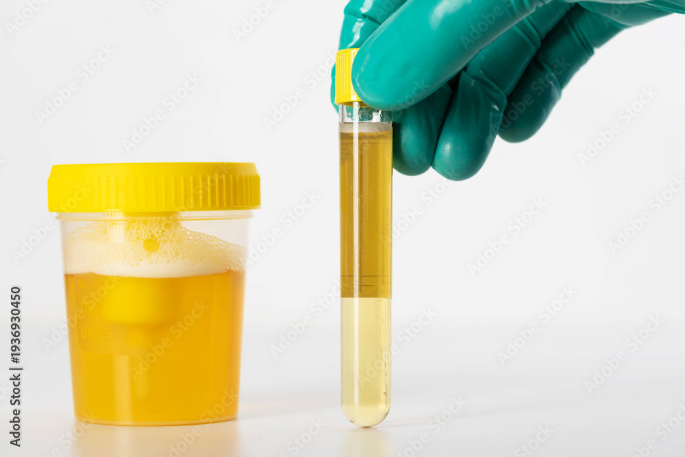 A laboratory technician's hand holds a test tube with urine for testing for bacterial culture and infections causing inflammation in the genitourinary system. Copy space for text #1936930450