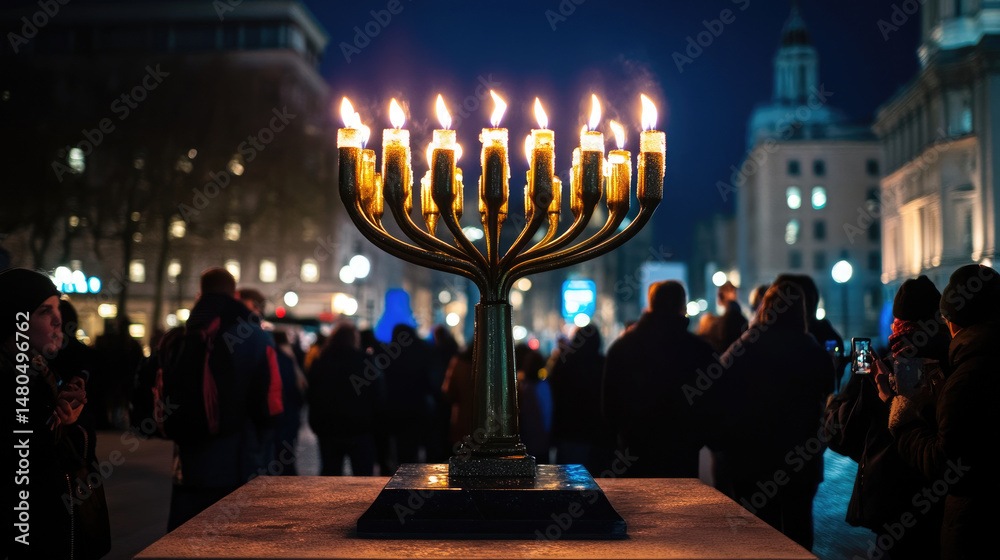 A large menorah illuminated with nine candles glows in a city square at night, crowd watches #1480496762