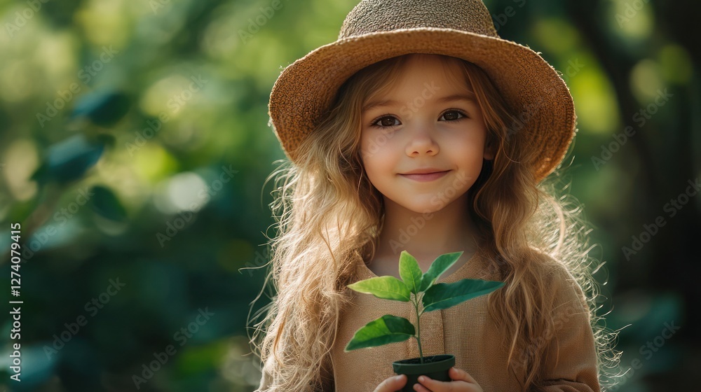 A little girl in an environmentalist outfit, holding a small plant, ready to save nature #1274079415