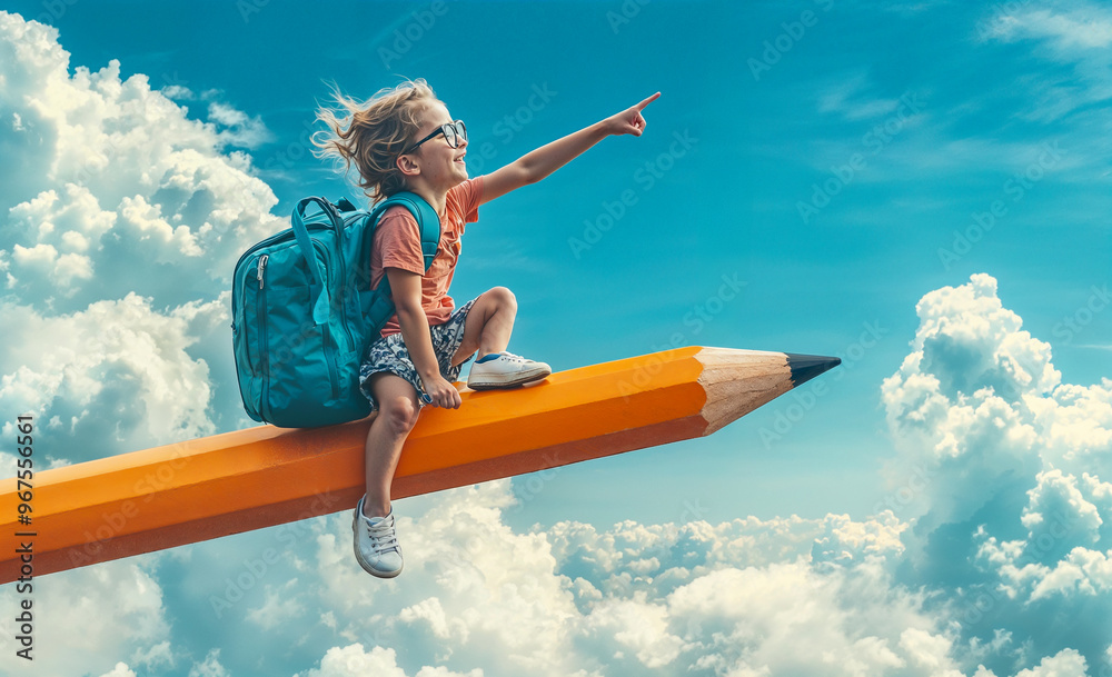 A little girl sitting on a giant pencil, flying in the sky, points ahead with her hand. The girl wears glasses and carries a school bag, back to school #967556561