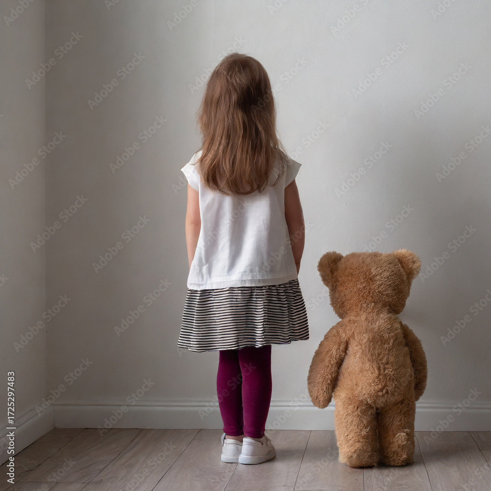 A little girl stands sadly with her teddy bear, facing the wall, because she is being punished. #1725297483