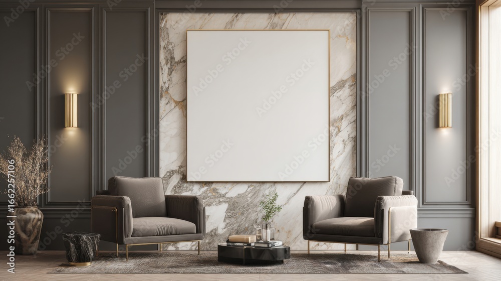 a living room with two chairs and a large poster #1662257106