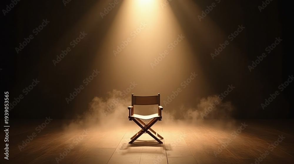 A lone director's chair sits centered on a vast empty stage with a spotlight shining down creating a dramatic atmosphere with smoke or fog around it #1939053565