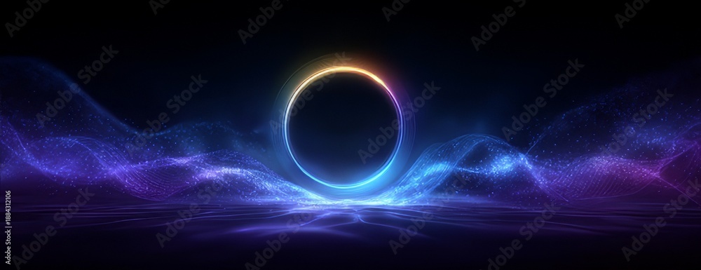 A luminous golden ring resembling a mysterious black hole or cosmic portal, with red-orange gradients and surrounded by flowing blue-purple nebula on a deep black background, creating a sense of unkno #1884312106
