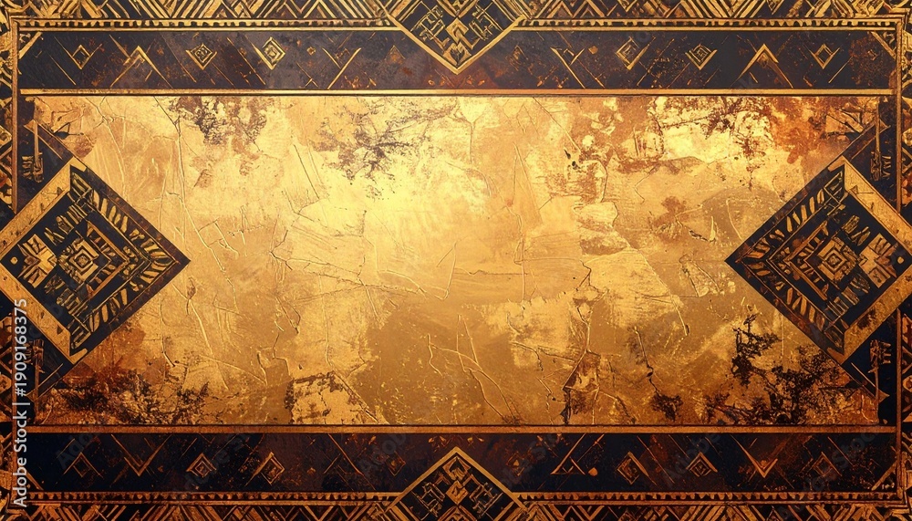 A luxurious art deco frame featuring dark geometric patterns and distressed golden texture provides elegant copy space for a stylized abstract background. #1909168375