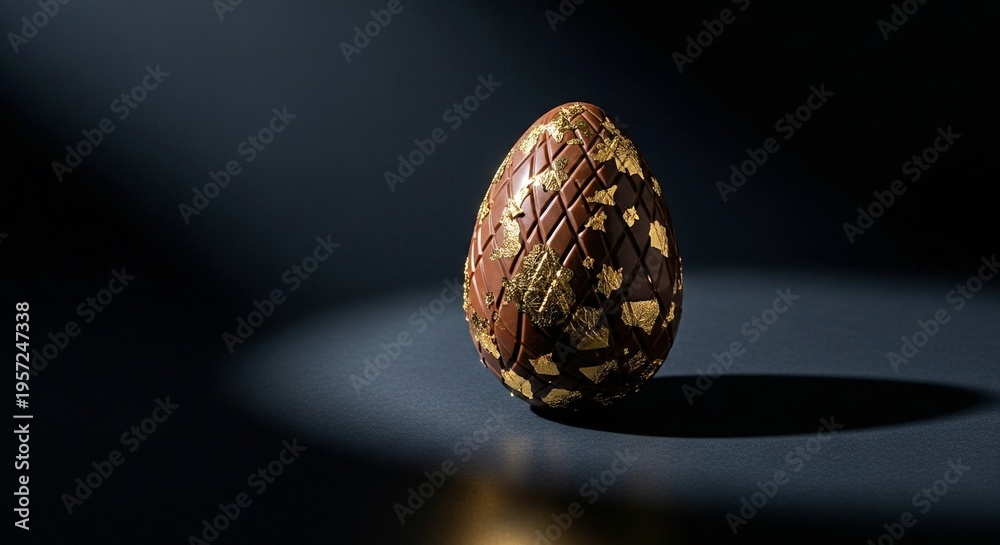 A luxurious chocolate Easter egg with gold leaf decorations on a dark background #1957247338