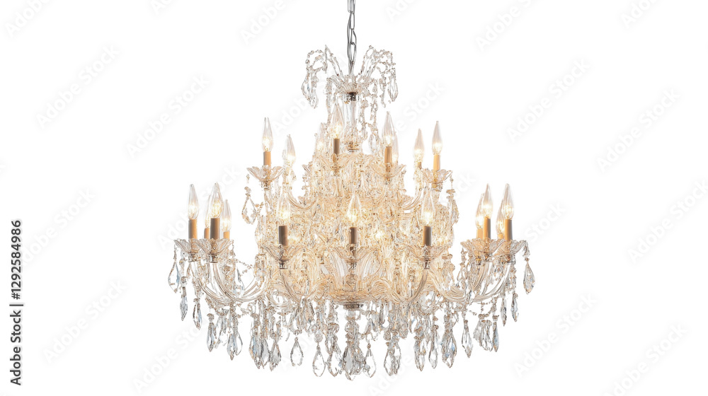 A luxurious crystal chandelier with multiple tiers of sparkling pendants, hanging elegantly against a clean white backdrop. #1292584986