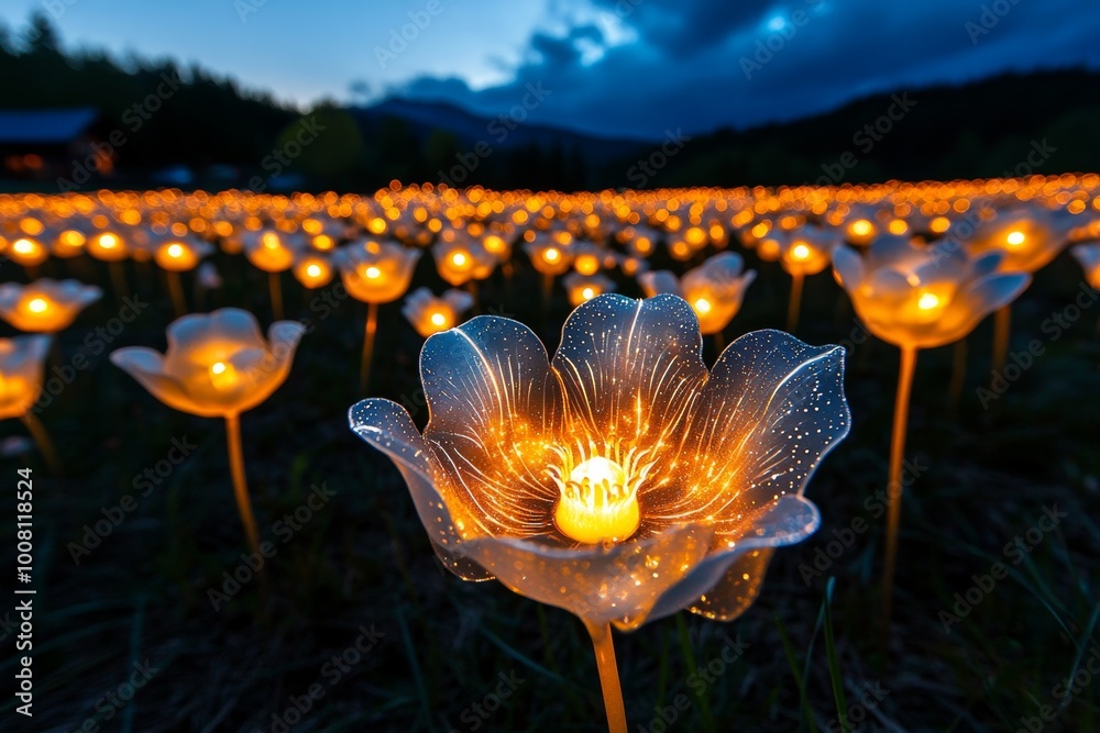 A magical field of flowers under a twilight sky, where the blooms are illuminated by soft starlight and appear to glow with a mystical energy #1008118524
