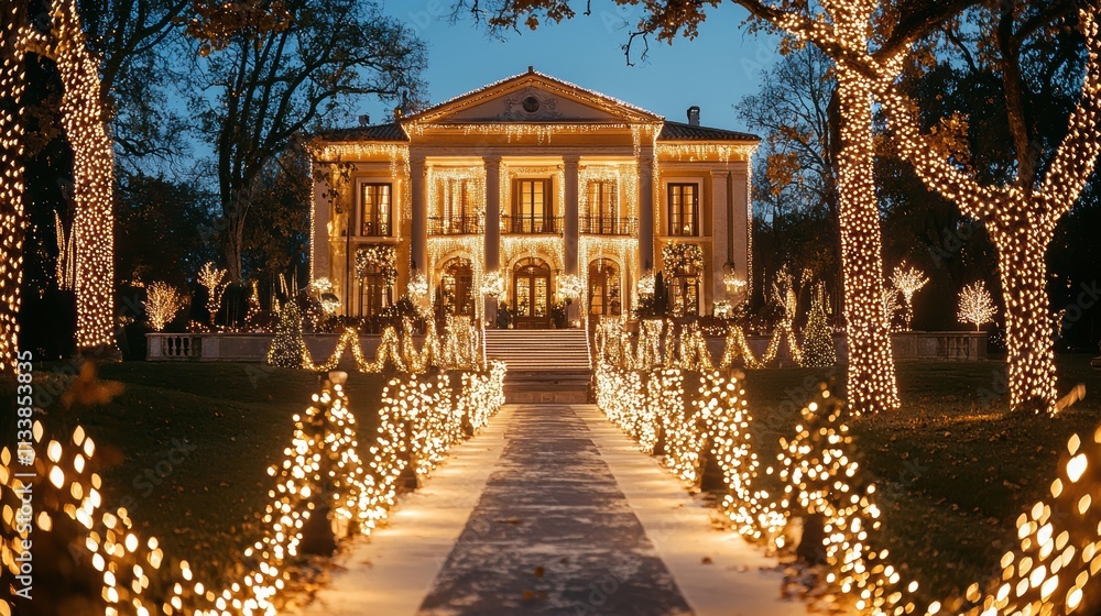 A magical holiday celebration at a beautifully decorated country estate with sparkling lights Guests arrive dressed in festive attire to enjoy the season in a luxurious setting #1133853835