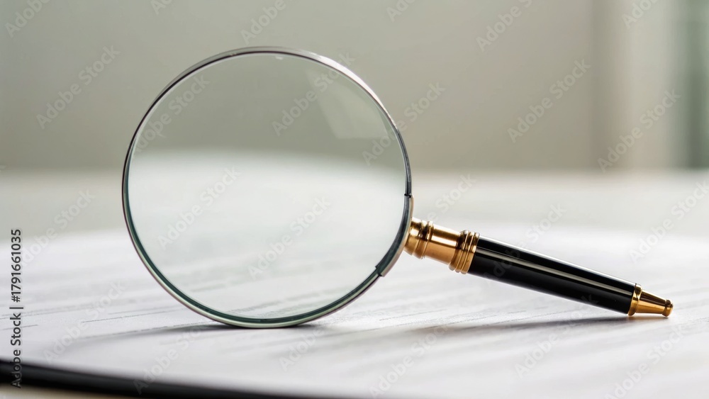 A magnifying glass rests on a document, highlighting the importance of detail and examination in research or investigation. #1791661035