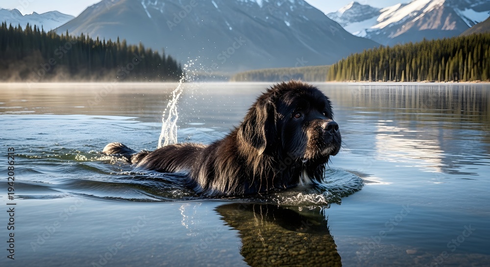 A majestic Newfoundland dog enjoys a refreshing swim in a serene mountain lake, surrounded by towering peaks and lush evergreen forests. #1942086213