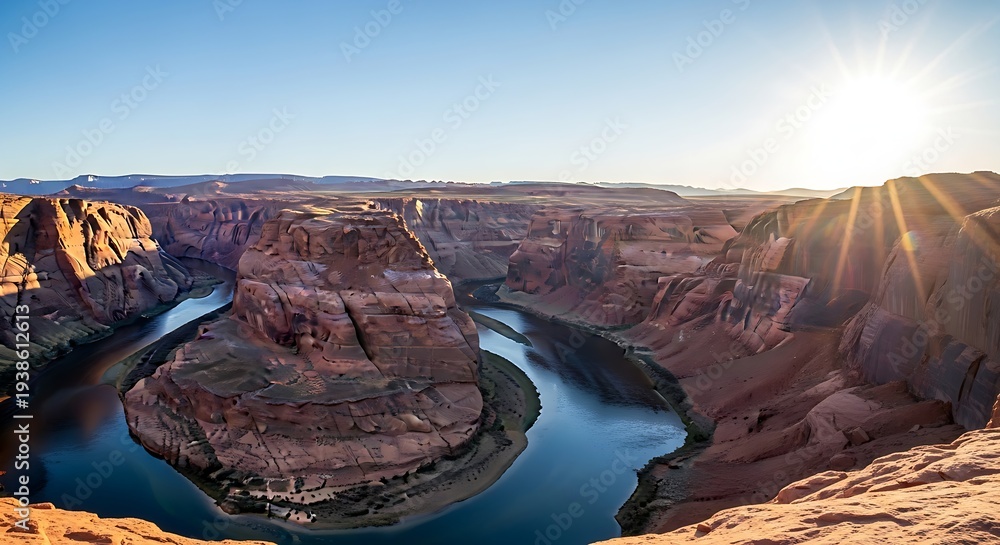 A majestic sunburst illuminates a winding blue river carving through a deep red rock canyon in the desert. #1938612613