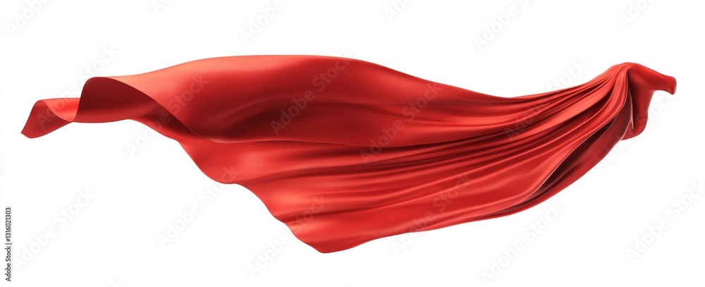A majestic superhero is depicted in a flowing red costume with a dramatic cape, isolated against a silk satin fabric backdrop that highlights superpower presence #1316021303