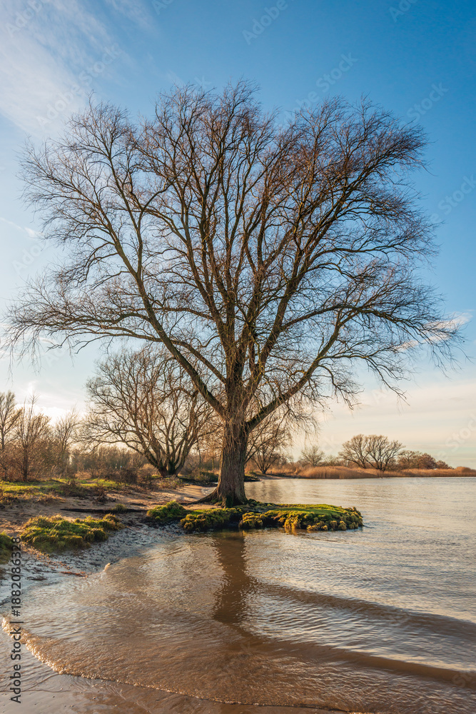 A majestic tree with its jagged, bare branches stands out as a silhouette against the clear sky. The photo was taken on a sunny winter afternoon on the banks of a Dutch river. #1882086328