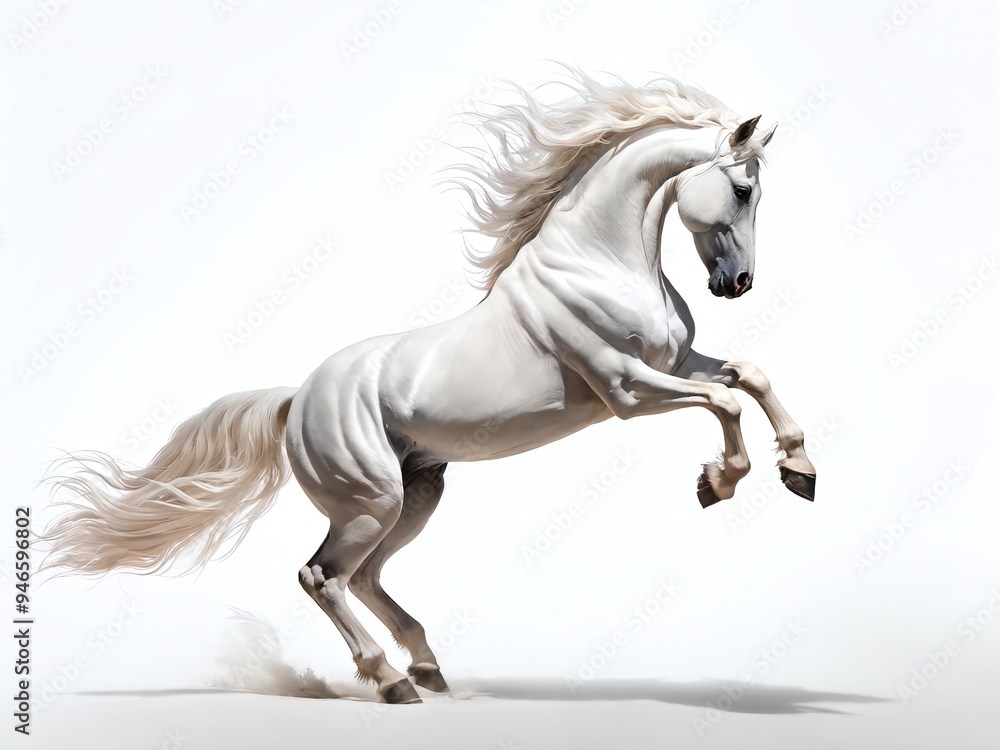 A majestic white horse rears gracefully against a solid backdrop, showcasing its strength and elegance #946596802