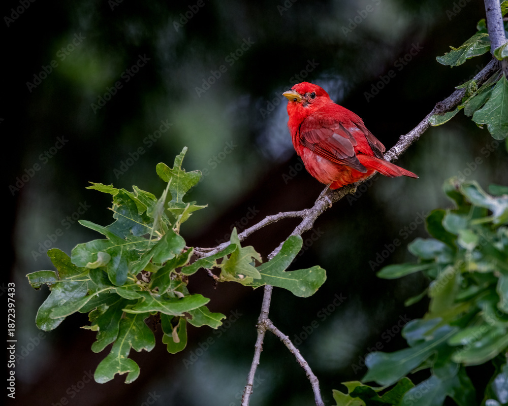 A male Summer Tanager posing among the leaves of a Burr Oak. #1872397433
