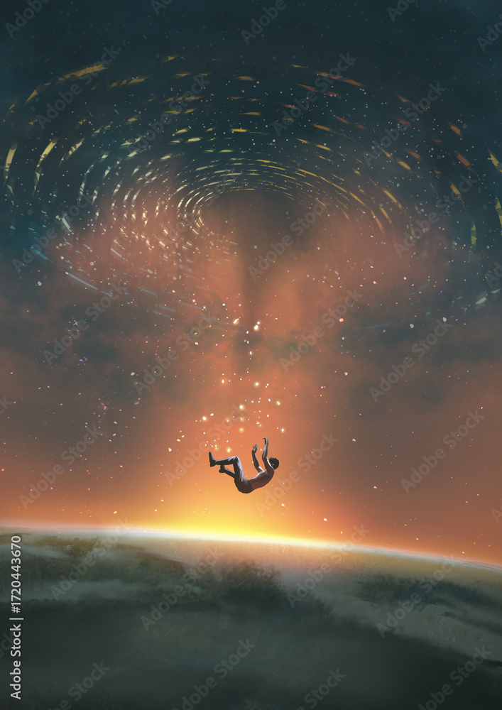 A man floats helplessly in space above a glowing planet as a swirling cosmic vortex pulls light and matter inward, digital art style, illustration painting #1720443670