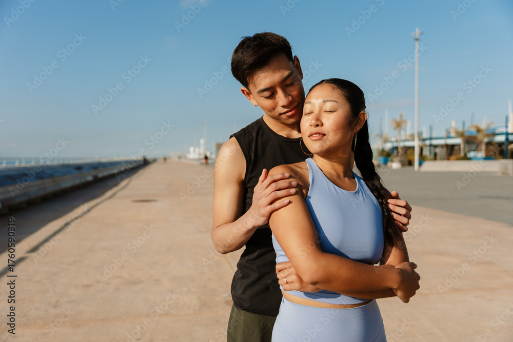 A man from behind placed his hands on the shoulders of a woman standing in front of him while they had their eyes closed #1760590319
