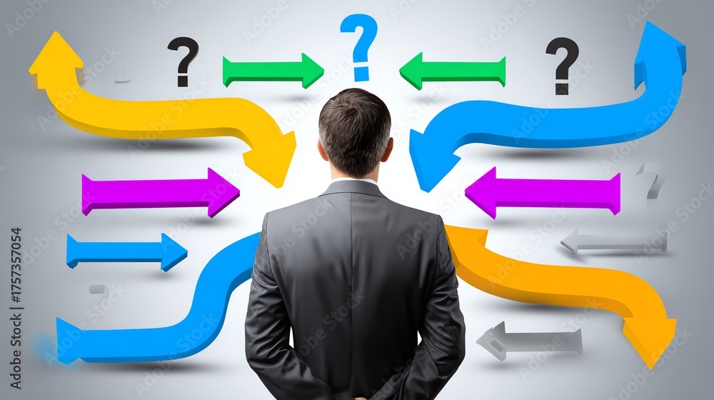 A man in a suit stands before colorful arrows and question marks, symbolizing decision-making and uncertainty in the business world. Explore the challenges of strategic choices. #1757357054
