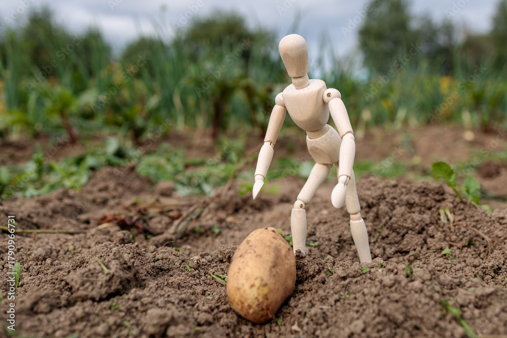 A man in a wooden figure is standing in a field of dirt and potatoes #1790966731