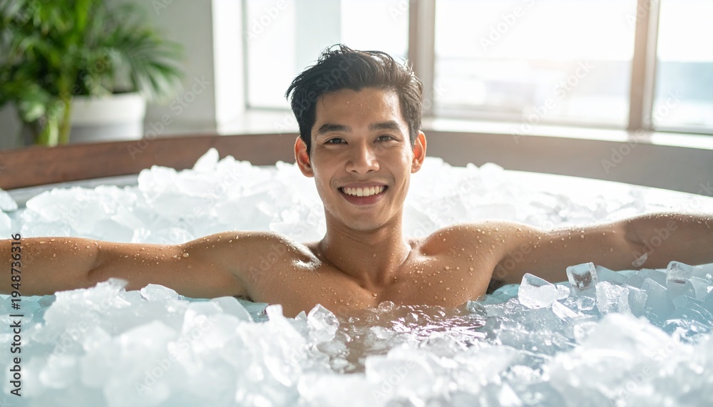 A man relaxing in a cold bath filled with ice, exuding a sense of rejuvenation and wellness #1948736316