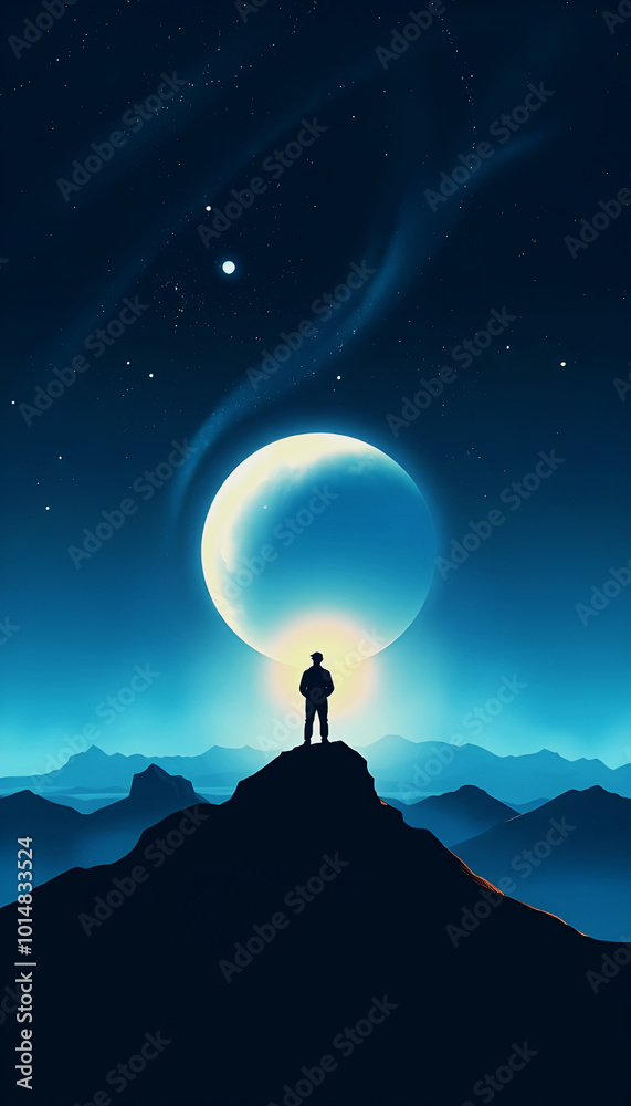 A Man Standing on a Mountain Peak and looking at the others Planet #1014833524