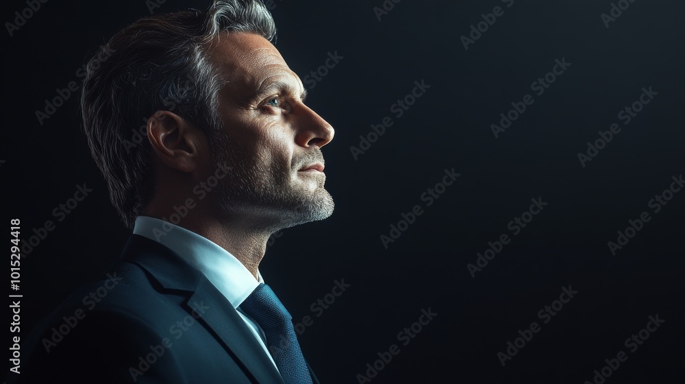 A mature man in a formal suit gazes contemplatively into the dark, highlighting wisdom and introspection, capturing a moment of deep thought and reflection. #1015294418