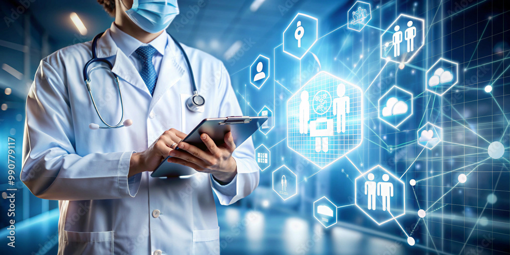 A medical professional using a tablet, surrounded by digital icons representing healthcare and medical technology, set in a modern hospital environmen #990779117