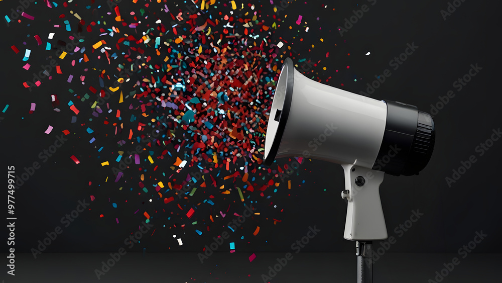 a megaphone with colorful confetti around, share good news concept #977499715