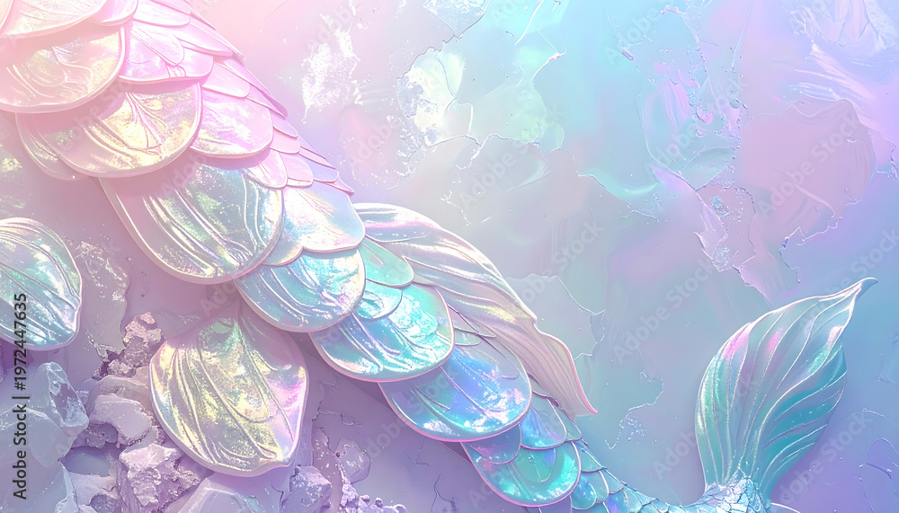 A mermaid's shimmering tail shines in an underwater scene with iridescent scales. #1972447635