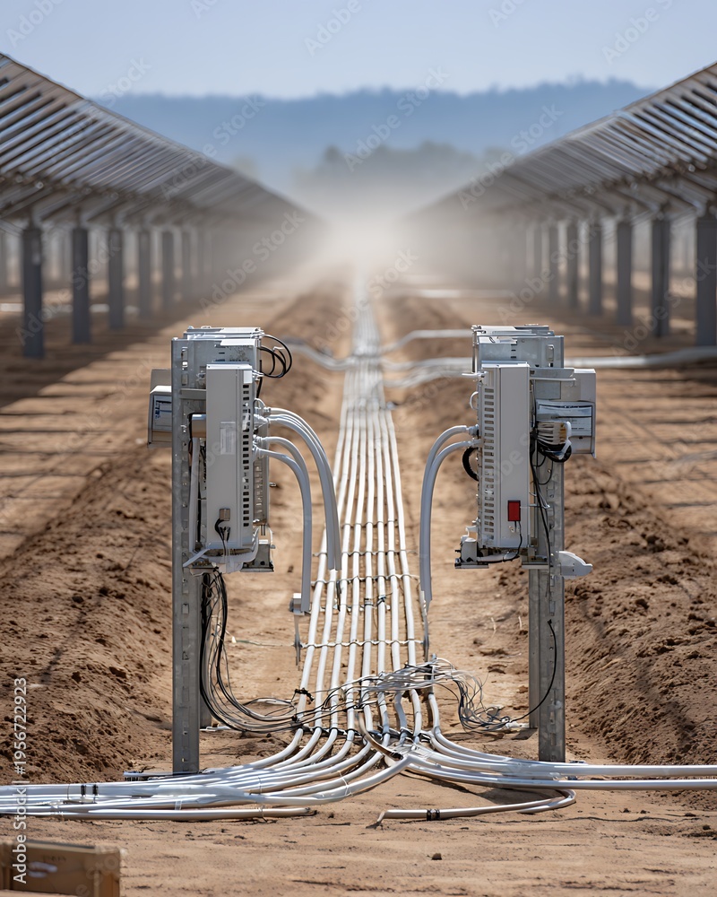 A mesmerizing perspective shot of a solar farm, showcasing a harmonious blend of nature and technology. The endless rows of panels stretch towards the horizon, radiating a sense of renewable energy #1956722923