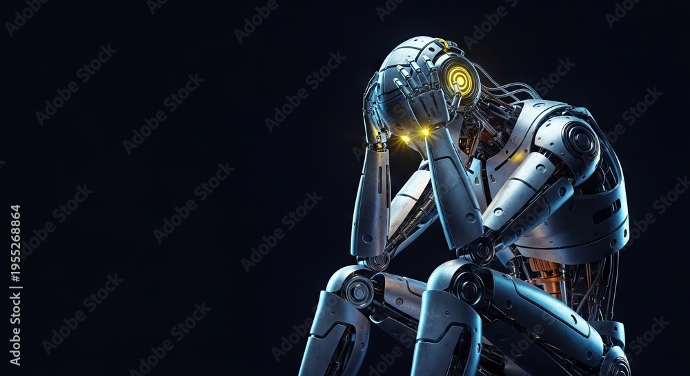 A metallic mechanical robot sits alone in a dark void, clutching its head while its glowing optic sensors flicker with dim yellow light, silver, industry, machine #1955268864