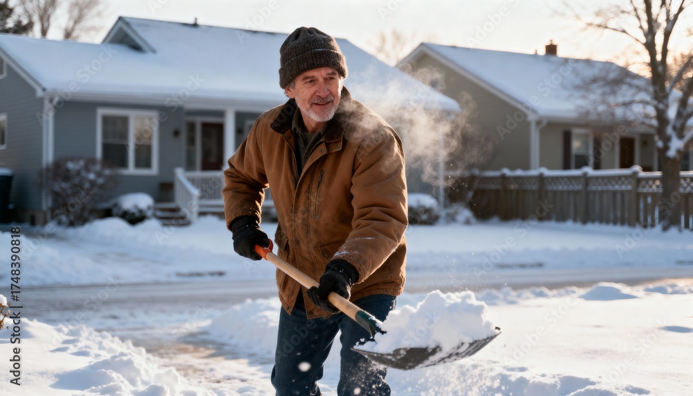 A middle-aged man shovels fresh snow in a quiet suburban neighborhood on a winter morning. #1748390818