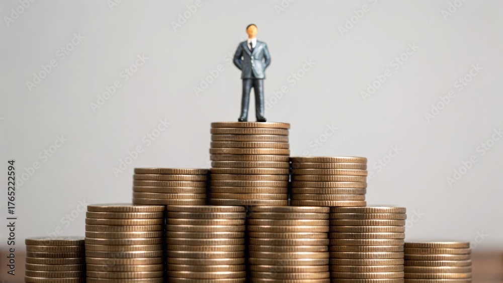 A miniature figure in a suit stands atop a pyramid of coins, symbolizing success and financial growth. #1765222594